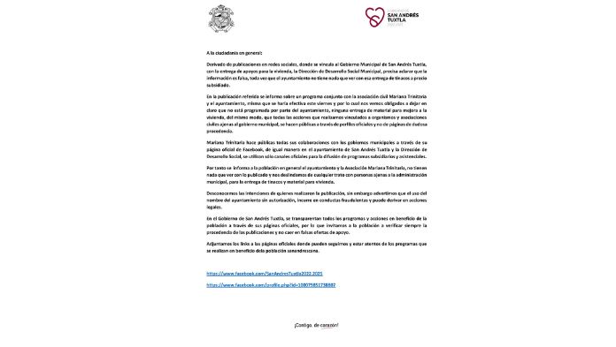 Derivado de publicaciones en redes sociales, donde se vincula al Gobierno Municipal de San Andrés Tuxtla, con la entrega de apoyos para la vivienda, la Dirección de Desarrollo Social Municipal, precisa aclarar que la información es falsa, toda vez que el ayuntamiento no tiene nada que ver con esa entrega de tinacos a precio subsidiado.