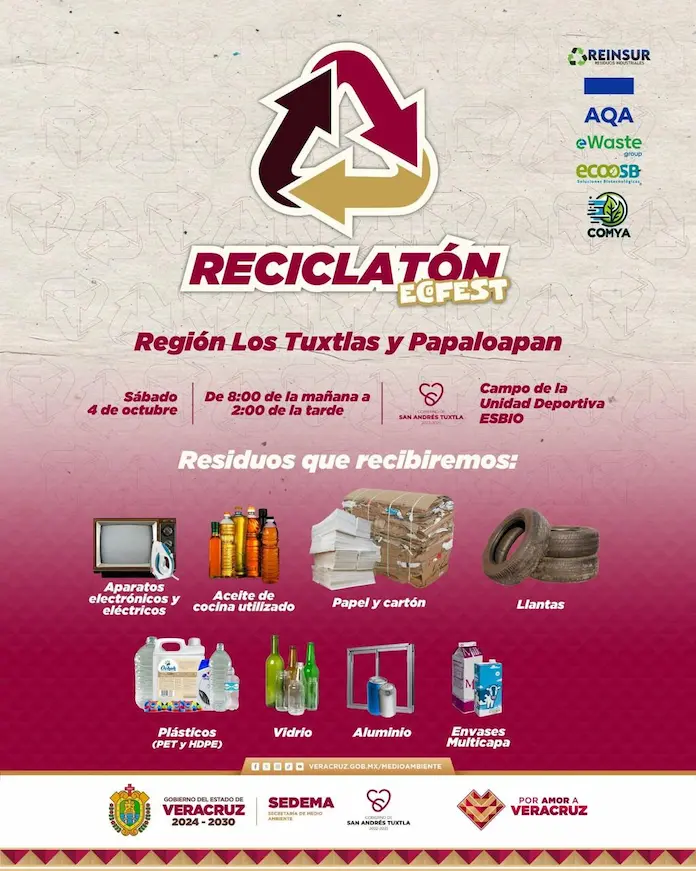 SAN ANDRÉS TUXTLA.-Cada acción cuenta, y tu participación es importante. El reciclaje es una herramienta poderosa para proteger nuestro entorno. Por eso te invitamos este sábado 4 de octubre de 8 de la mañana a 2 de la tarde en la Unidad Deportiva ESBIO, para participar en el Reciclatón Ecofest: Región Los Tuxtlas y Papaloapan.