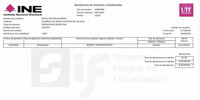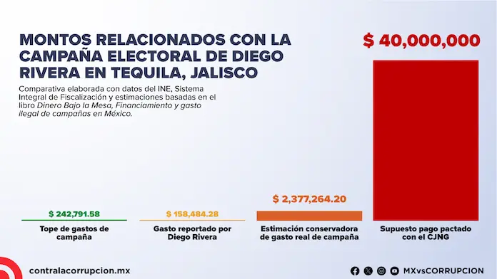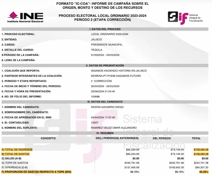 De acuerdo con la información oficial del Instituto Nacional Electoral (INE), la campaña de Diego Rivera en 2024 para la presidencia municipal de Tequila, Jalisco, tuvo un costo total de 158 mil 484 pesos. Este gasto fue incluso austero: de los 242 mil pesos que era posible gastar en ese municipio, Diego Rivera reportó haberse limitado a usar solo 65% del tope de gastos de campaña. ¿Son creíbles estas cifras? De ninguna manera.