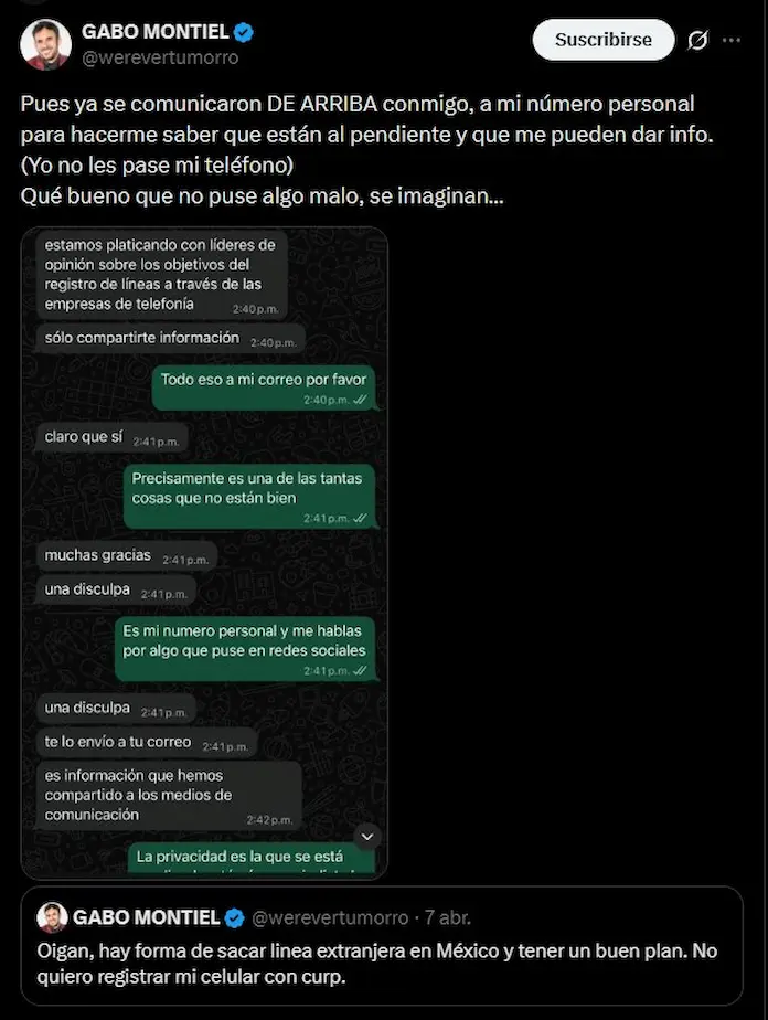 En la conversación, esta persona que quedó en el anonimato le explica a Montiel que están platicando con otros líderes de opinión sobre los objetivos del registro de celulares, que en todo caso, solo sería compartir la información.